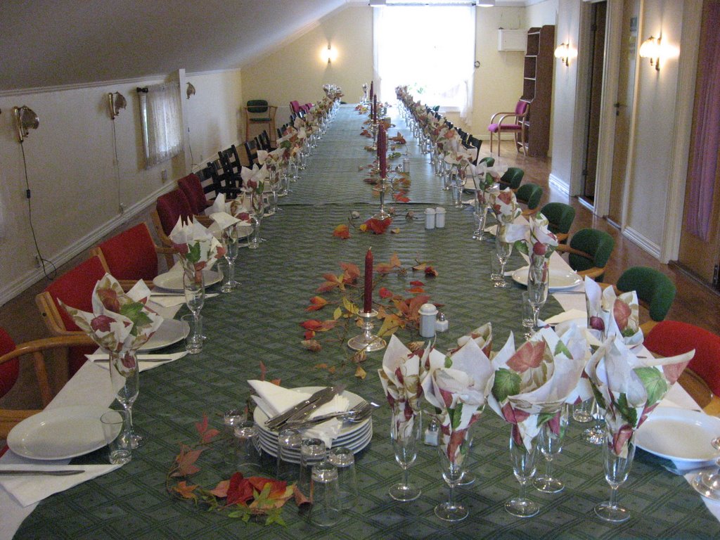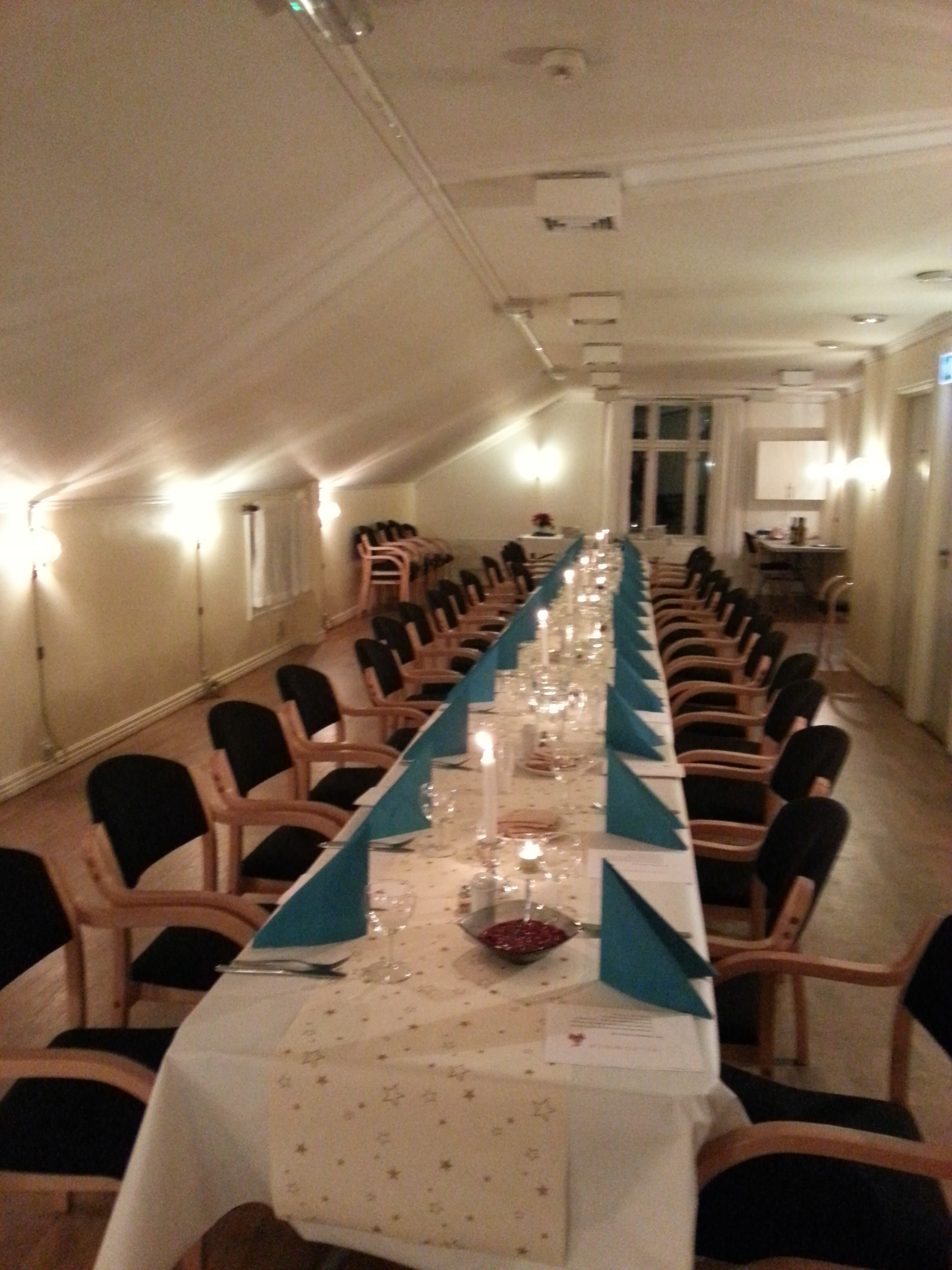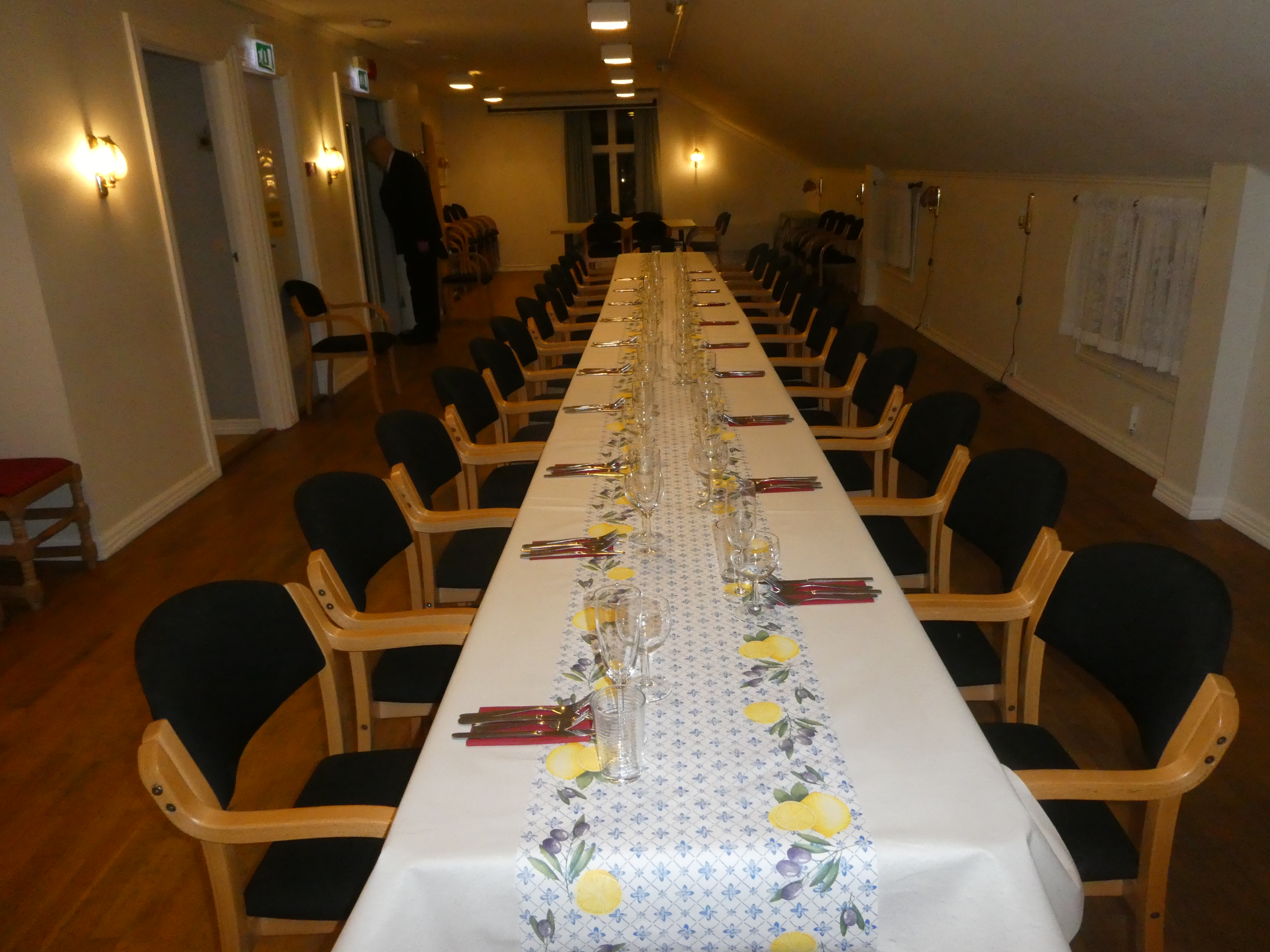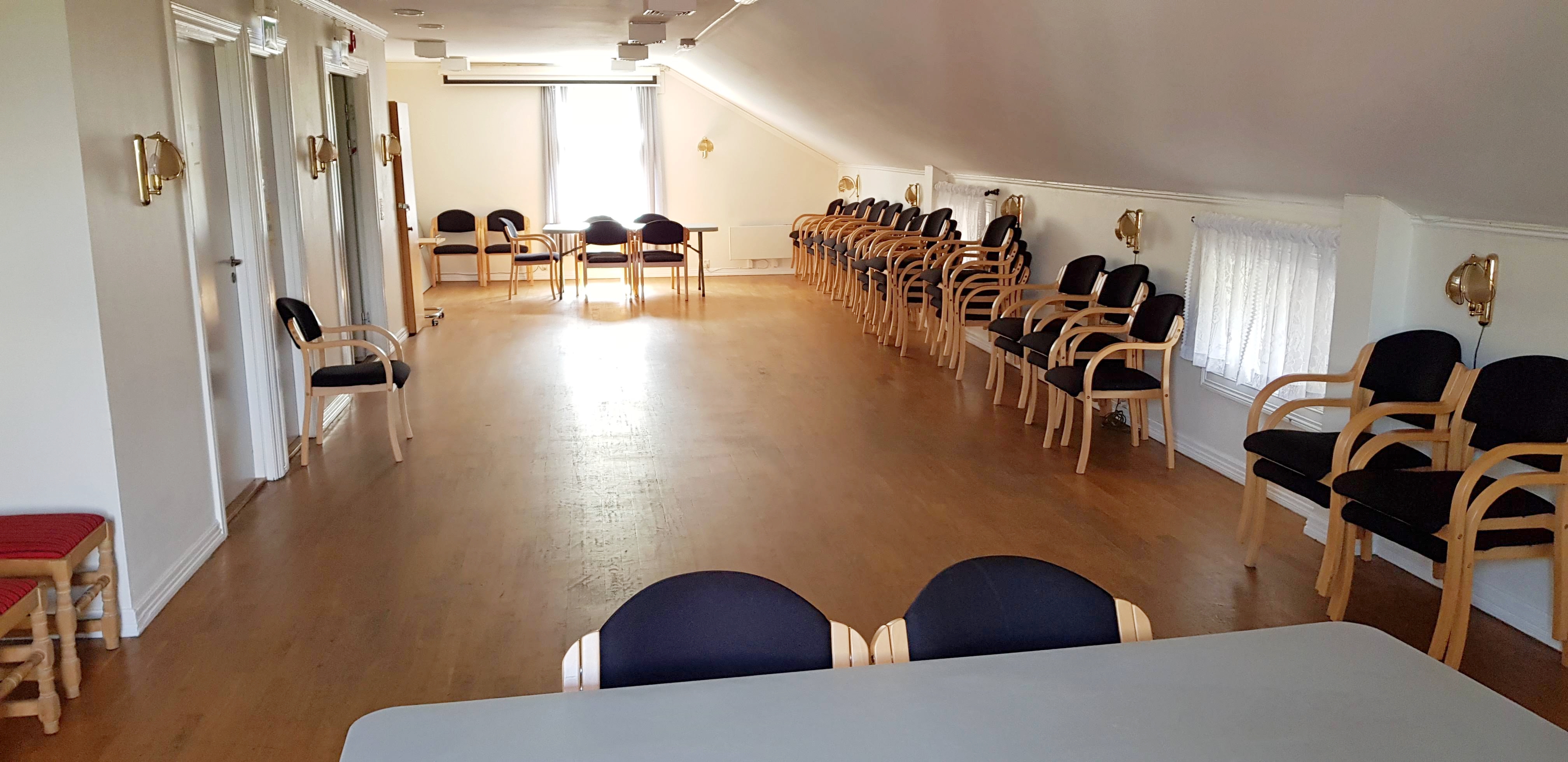 Det er en stor sal i 2.etasje med 50 stoler og 14 bord som kan arrangeres etter behov. Målene på bordet er 180 x 75 cm. Brannvesenet setter en maksimal grense på 40 personer på en gang.