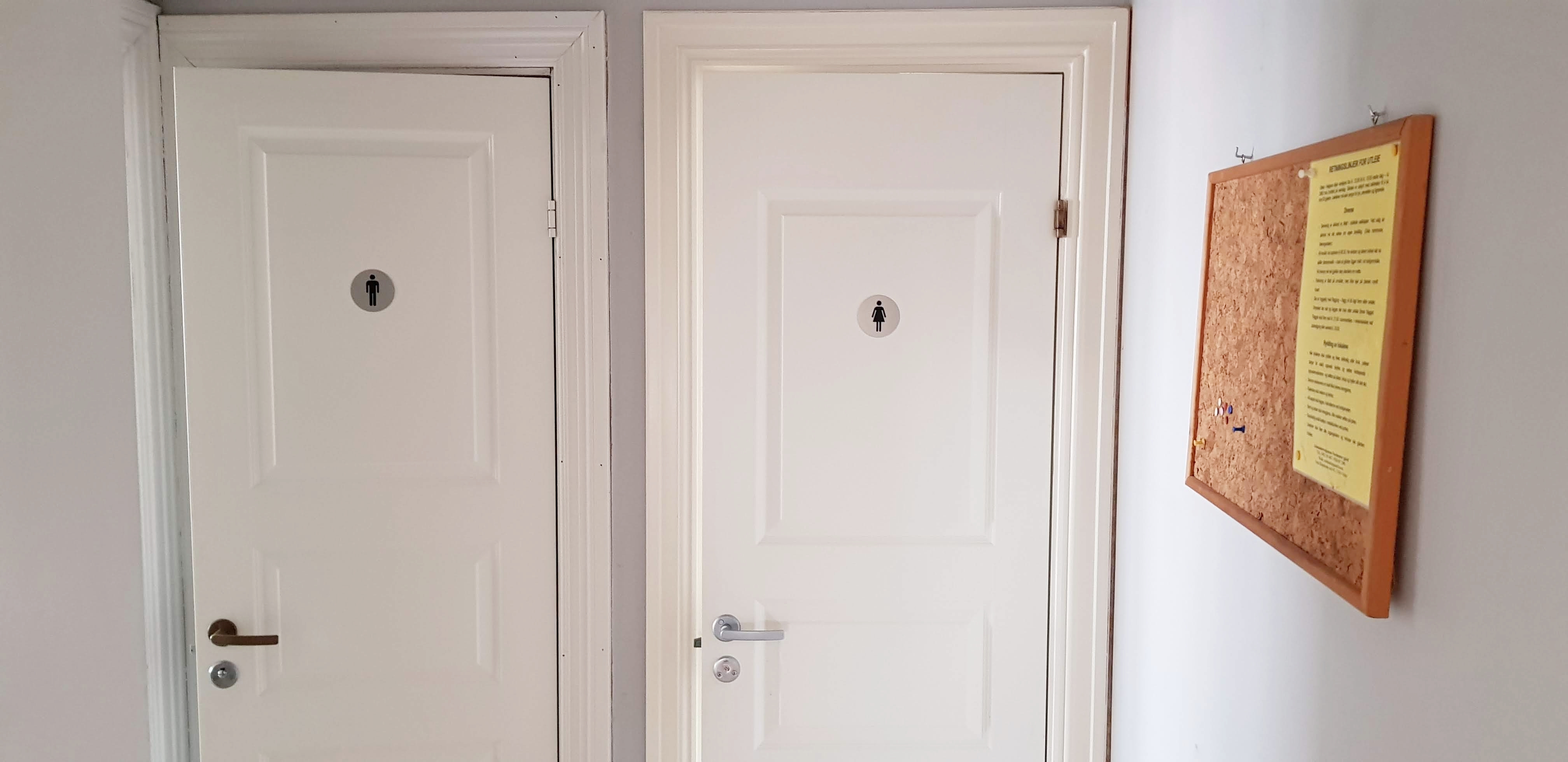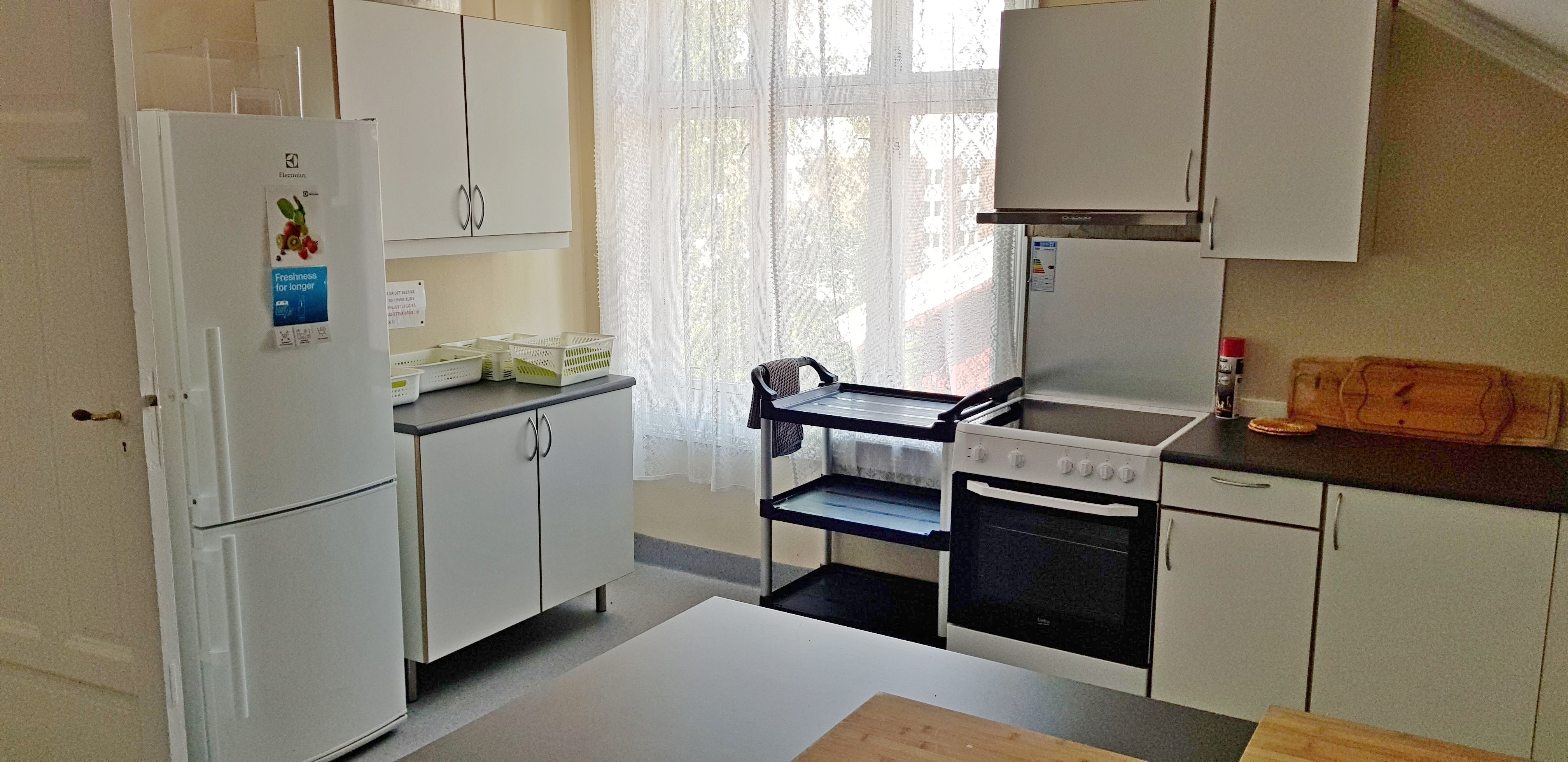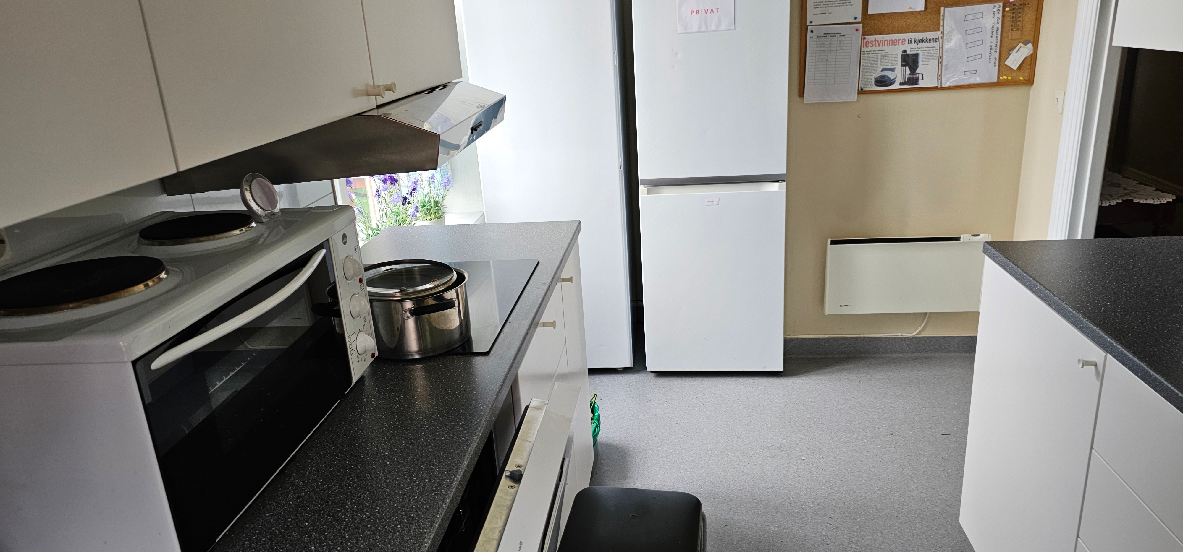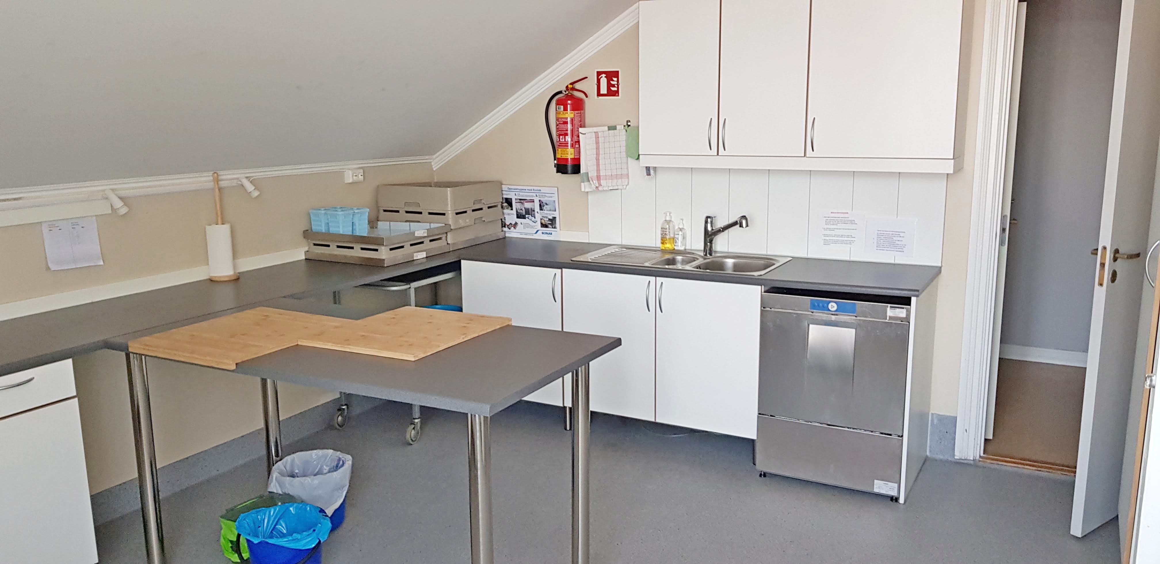 Det er 2 toaletter i begge etasjer, kjøkken m/oppvaskmaskiner, komfyrer, kaffetraktere og kjøleskap i begge etasjer, dekketøy til 40 personer, glass nede til kaffe avec, etc. Kjøkken er ikke egnet til å lage mat i, men medbrakt mat kan varmes i ovn/plater. Det er komfyrer i begge kjøkken.